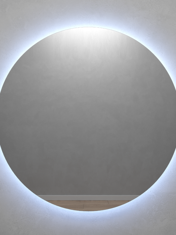 Безрамное зеркало круглой формы с контурной (тыльной) холодной подсветкой, свет 6000К. Подложка из высококачественного МДФ, светодиодная лента защищена матовым свето-рассеивателем от попадания пыли и влаги. Есть вывод 220W для подключения к сети, включение подсветки от выключателя на стене, либо от розетки.